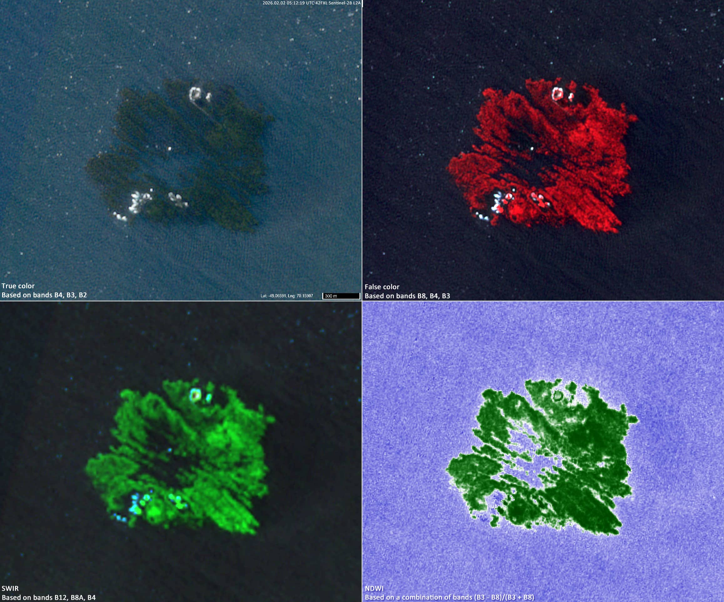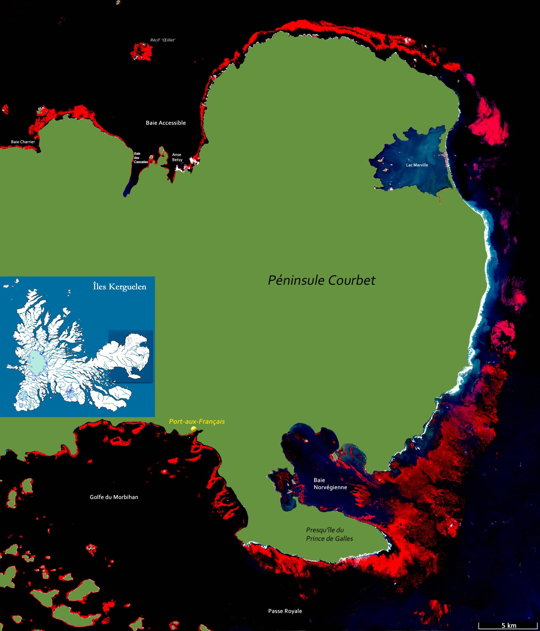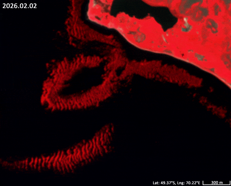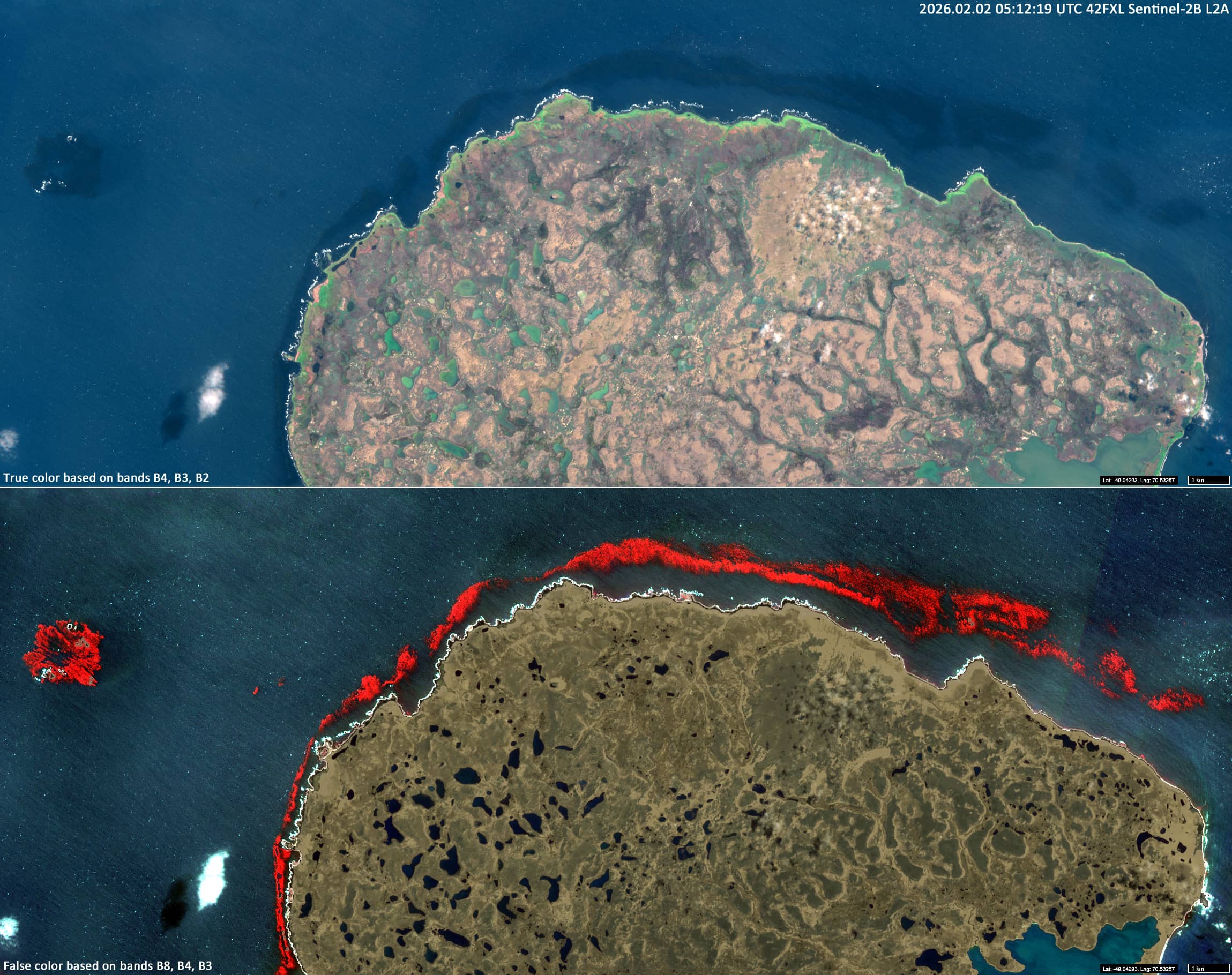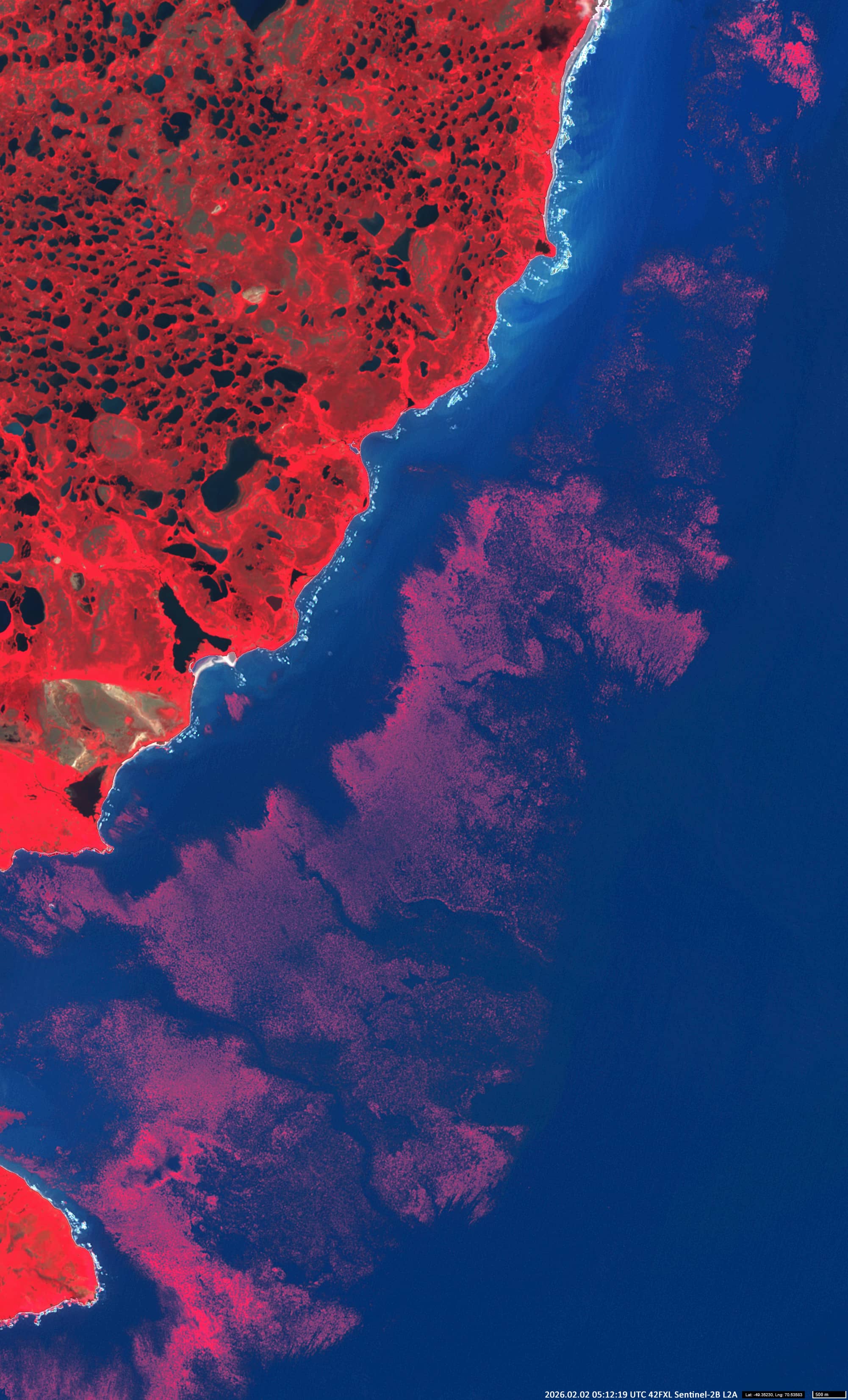 Sentinel-2 data reveal fragmented kelp forests around the Courbet Peninsula (Figures 1 to 3). show fragments of subtidal kelp forests detected in Sentinel-2 imagery, primarily through the use of the B8, B4 and B3 RGB composition.