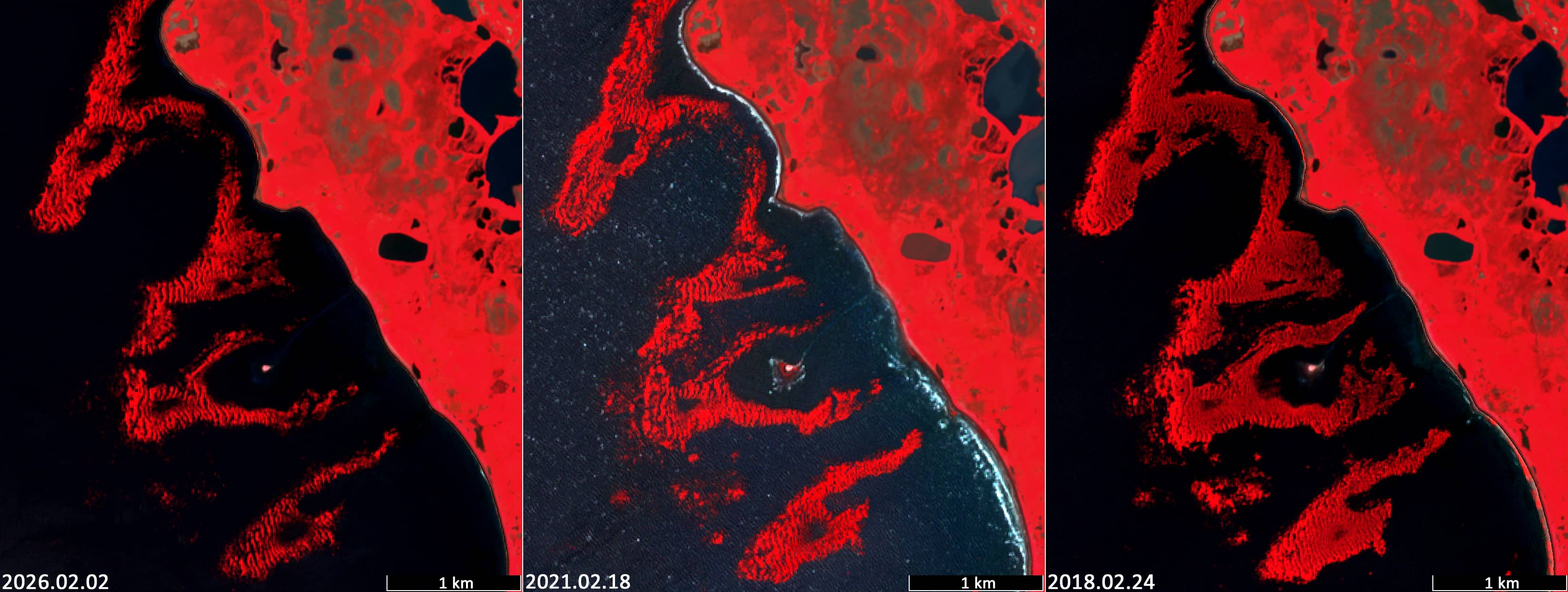 When using near-infrared false-colour composites (R→B08, G→B04, B→B03), they stand out clearly in red tones, while open water appears dark due to strong absorption in the NIR range.