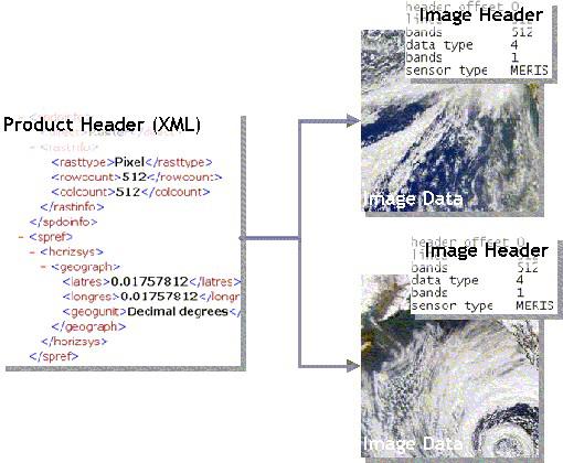 The reason why the image data is not directly stored in XML is simple: The product header is plain text, and an image stored in text format requires about 4 to 10 times more space than the simplest binary format and therefore requires considerable processing overhead when reading to and writing from such files.