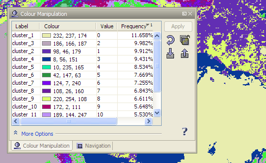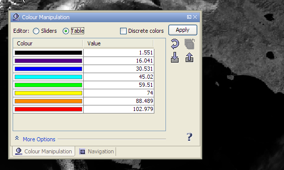 Labels and colours are simply changed by clicking into the corresponding table cell. In the More Options panels you can adjust the No-Data Colour.