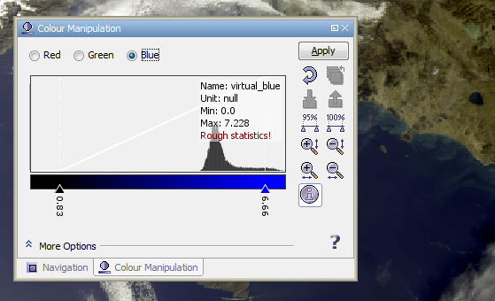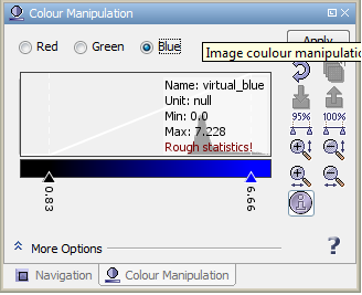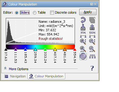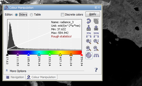 If you are opening an Image View of a data product's band or tie-point grid, VISAT either loads image settings from the product itself (BEAM-DIMAP format only) or uses default colour settings. The Colour Manipulation tool window is used to modify the colours used in the image. Depending on the type of the source data used for the images, the colour manipulation window offers for different editors: