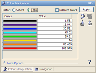 By changing the Editor option from Sliders to Table the sample value to colour assignment can be done in a table: