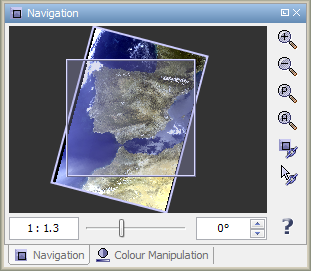 The Navigation Window is used to move the viewport of an Image View, to zoom in and out of it and to rotate the image in steps of 5 degrees using the spinner control below the image preview. The current viewport is depicted by a semi-transparent rectangle which can be dragged in order to move the viewport to another location. It also provides a slider used to zoom in and out of the view: