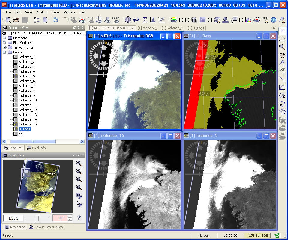 The following image shows VISAT with four image views that have been arranged with the Tile Evenly command of the Window menu. With synchronisation enabled, all image views use the same viewport: