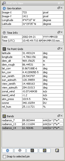 Note: In the Preferences Dialog you can deselect the option that only pixel values of displayed bands are shown.
