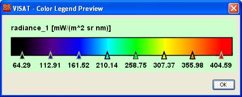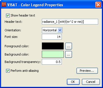 For non-RGB images it is possible to export the current colour palette setting as a colour legend image. This function is available from the context menu over non-RGB images. The menu item Export Color Legend brings up a file chooser dialog allowing you to select the file name for the exported legend image. The legend appearance can be modified by opening the Properties... button in the file chooser: