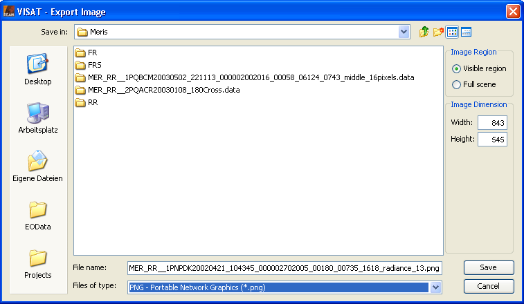 The save image dialog offers the possibility to choose whether the visible region or the full scene should be exported. The exported image exhibits all layers that are visible in the image view.