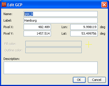 The GCP edit dialog is used to edit the properties of a GCP after a new GCP has been created or after a selected GCP has been double-clicked. This dialog is also available in the GCP manager.