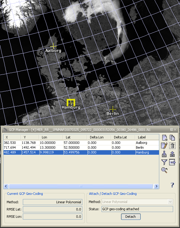 On the lower left hand side information about the currently attached GCP geo-coding is displayed.