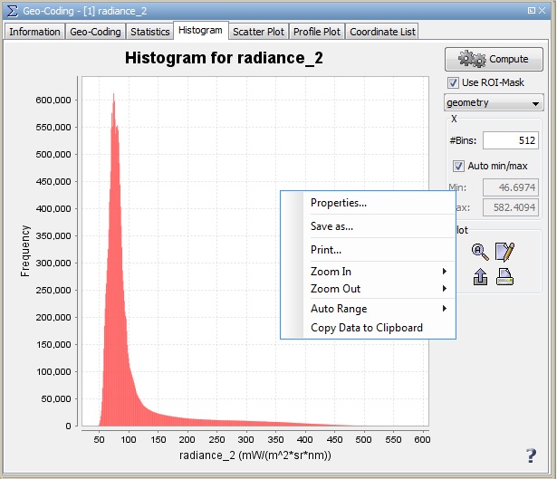This dialog displays a histogram for the selected band.