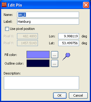 The pin edit dialog is used to edit the properties of a pin after a new pin has been created or after a selected pin has been double-clicked. This dialog is also available in the pin manager.