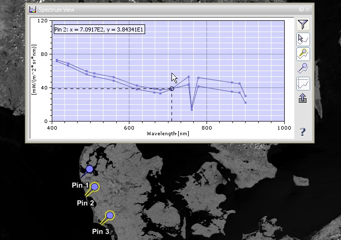 If you now move the mouse cursor over an image view, the spectrum will immediately display the spectrum for the current pixel position. Note that the spectrum view can only display the intensities of spectral bands. The spectrum view will remain empty for products without any spectral bands.
