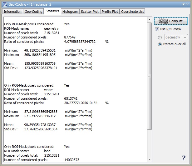 Displays statistical information about the band or an active ROI.