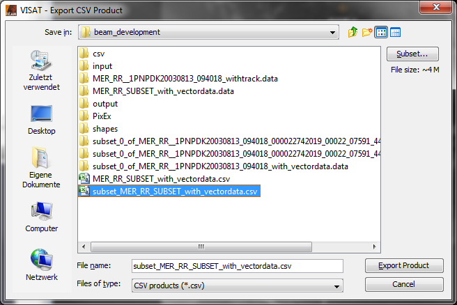 BEAM/Visat supports the export of raster data as CSV ('Character Separated Value') data into plain text files. To invoke this export, choose the item 'Export Raster Data' --> 'CSV' from the BEAM/Visat 'File' menu. A file chooser dialog will be displayed to select an export file (extension .csv). By default, all bands, tie point grids and metadata sets will be exported to the CSV file (row by row from top to bottom of the product raster, each row from left to right. Each pixel is represented by one line in the CSV file, each quantity by one column. An additional column with the 'featureId' (which is just an ascending pixel counter) is put in front. Also, the file contains a header line with the names and data types for each column (name and data type separated by ':'). The column separator is the 'tab' character. See example below.