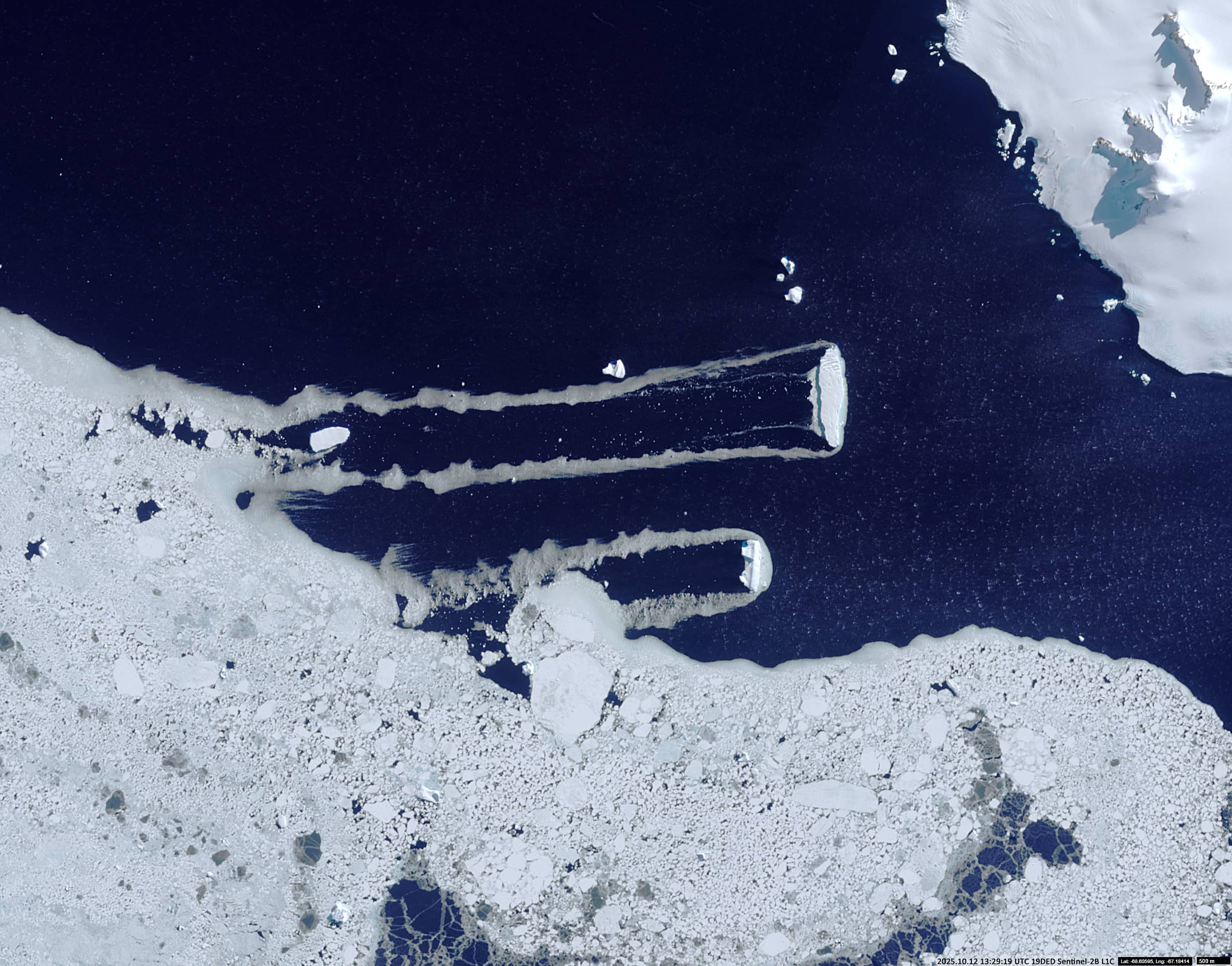 Sentinel-2 satellite imagery revealed an interesting situation in which drift ice – a collection of small floating ice fragments – being driven westward out of Mikkelsen Bay by wind and ocean currents. This flowed around the edges of the two grounded icebergs, creating the impression that they were moving rapidly eastwards.