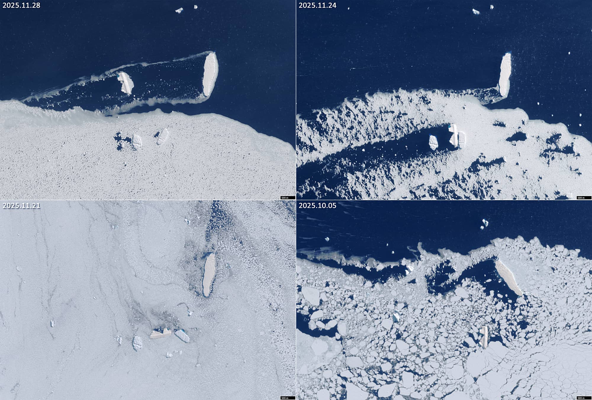 Figure 2 shows examples of ice conditions in the Mikkelsen Bay, as well as the situation after MIK-2 moved into the lee of its larger neighbour.
