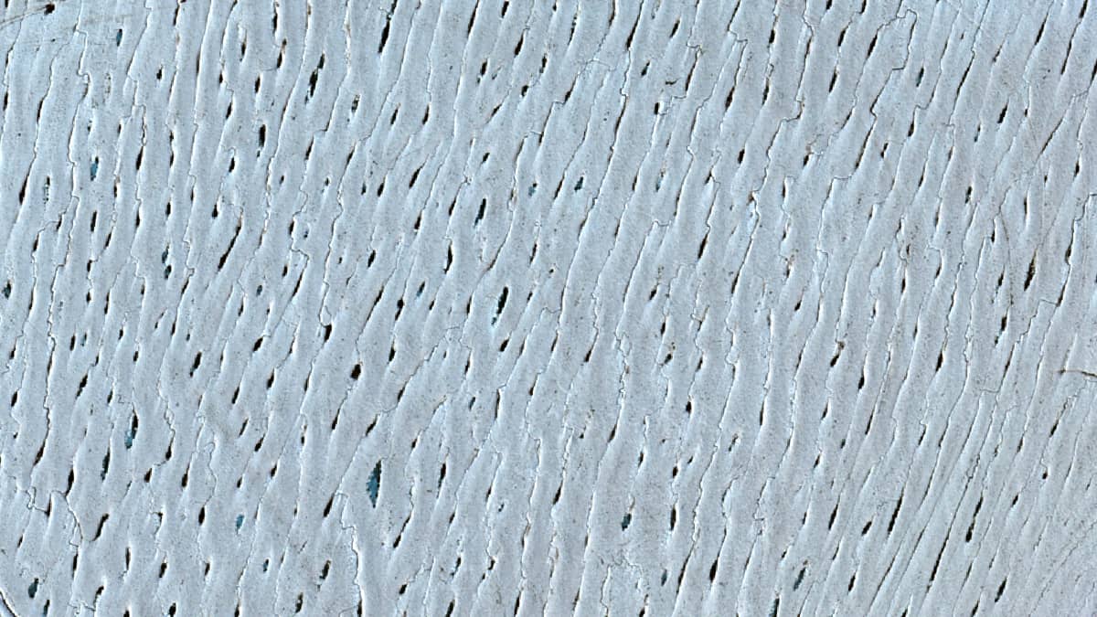The image shows an ice floe in Jokel Bay and its impressive surface structure. It is located offshore of King Frederick VIII Land, north-east of Greenland. To the north is Lamberts Land, to the west the Zachariae Isstrøm flows into the bay. To the east the Achton Friis Islands & Schnauder Island seal the bay off and hamper the ice floe from moving further east.