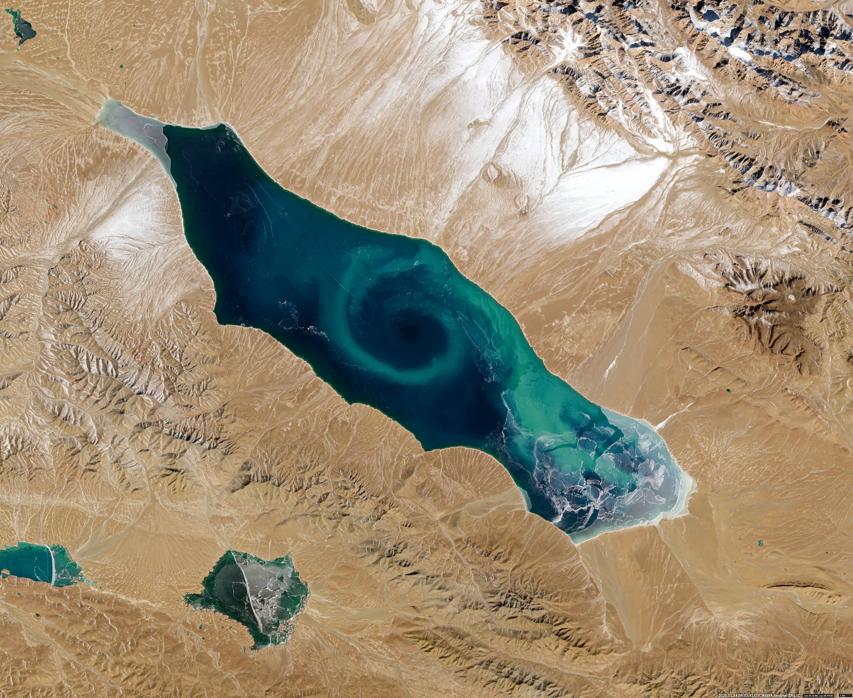 The lake is usually ice-free from late June to late November. During this period, satellite observations often reveal a large vortex of planktonic biomass and suspended sediments in the centre of the lake that extends almost the entire width. These vortices vary in chromatic intensity and particle concentration. The vortex structure is particularly clearly visible in the image shown. We can even see the water colour and its patterns below the partly transparent to semi-transparent ice, which makes the images even more special.