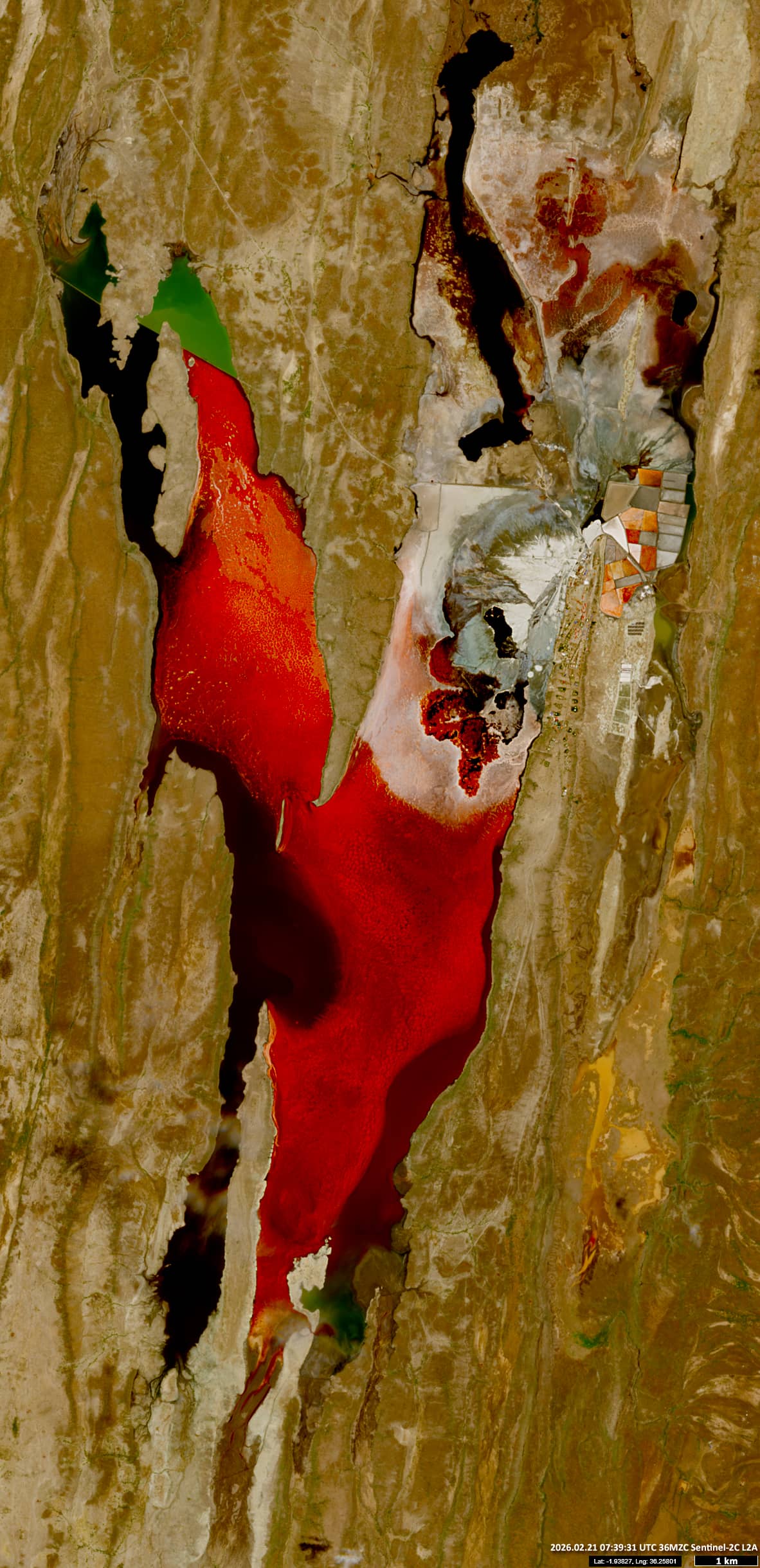 The true-colour Sentinel-2 image presents Lake Magadi in East Africa. The most striking feature is the intense red colour of the water, which is exactly how it appears to the human eye.