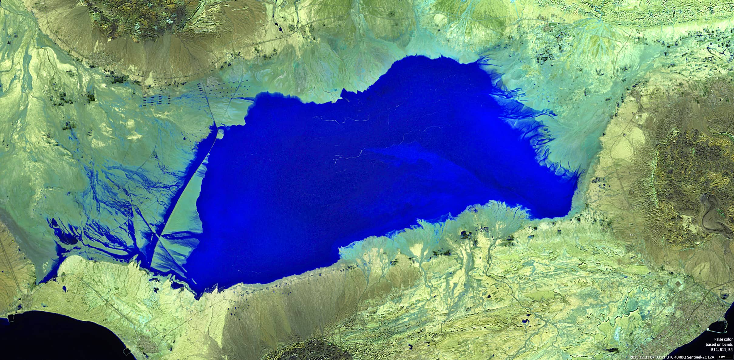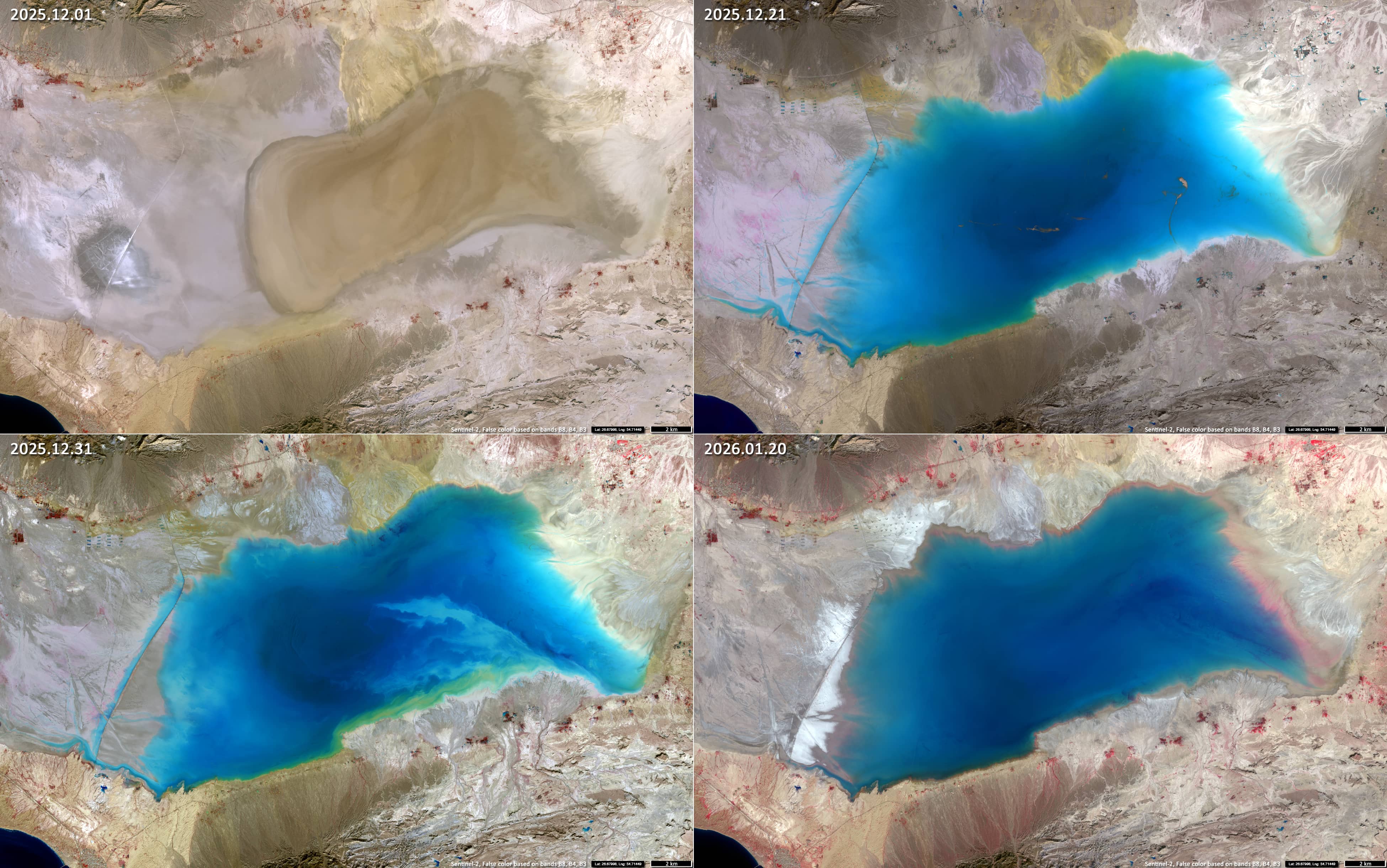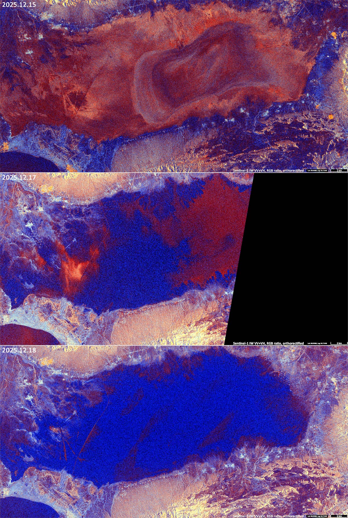 During the 2025-2026 hydrological season, the lake overflowed on 16 and 17 December 2025, following heavy rainfall accompanied by southwesterly moisture transport from the Persian Gulf (see Sentinel-1 image in Figure 1). The Sentinel-2 image taken on 21 December (Figure 2) show the lake after the clouds had cleared. At this point, the water surface area had expanded to approximately 190-200 km².
