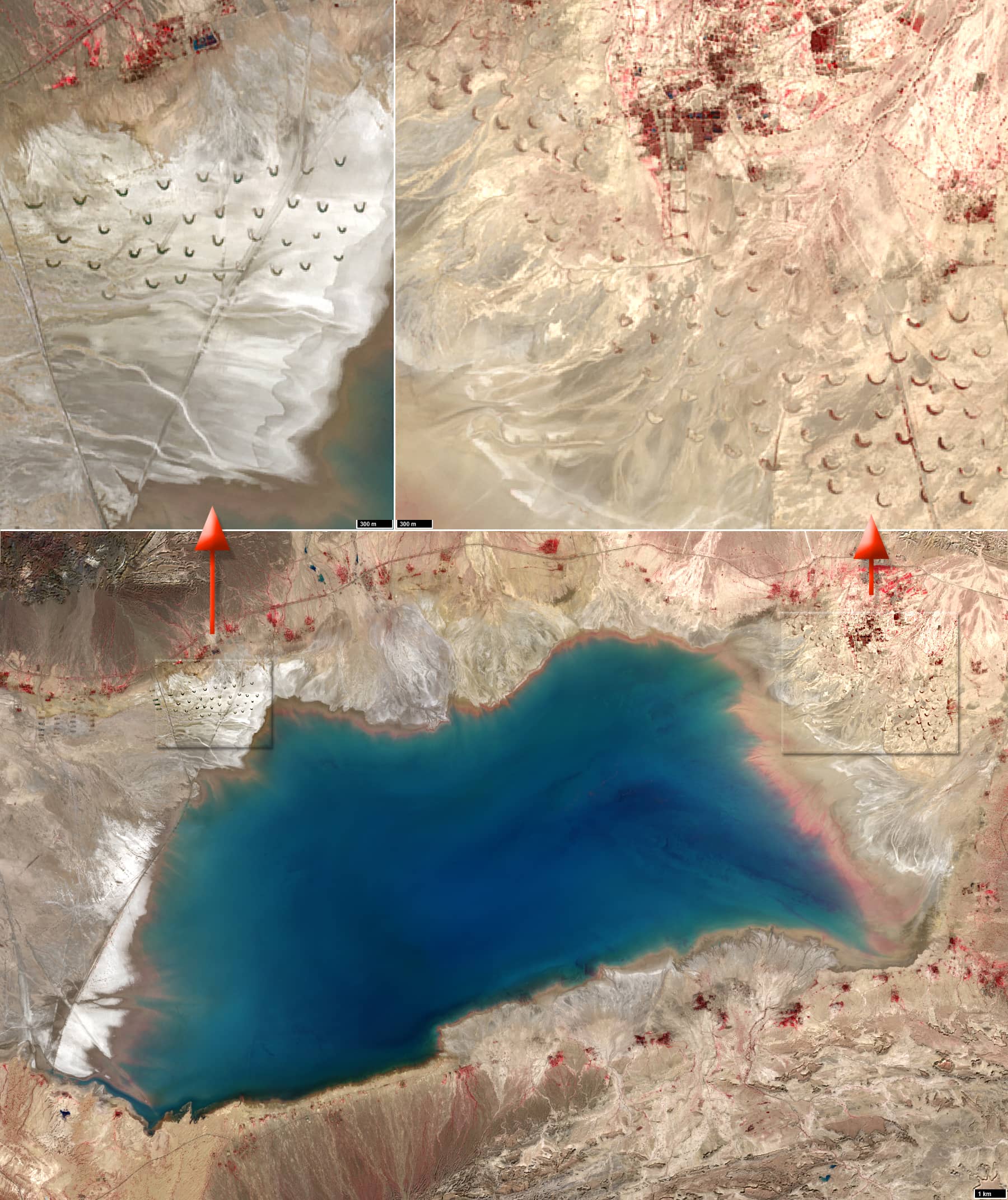 More than 80 structures located east of the lake, south of the Mehregan palm grove (نخلستان مهرگان) and Mehrkan caravanserai (کاروان سرای مهرکان), are identical regular semicircular structures with a diameter of 150±5 m have been identified (“east” site). These features were already present in 2016.