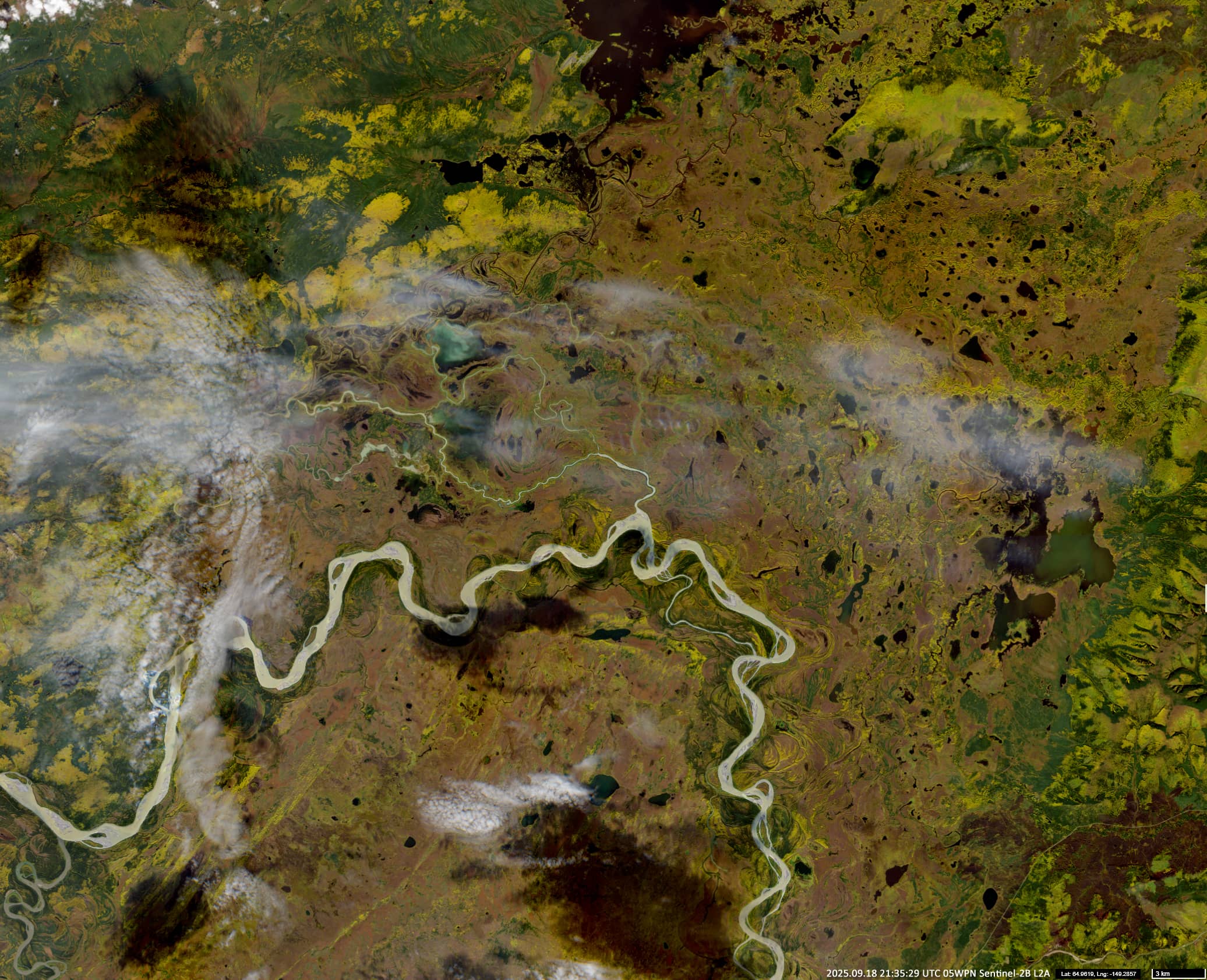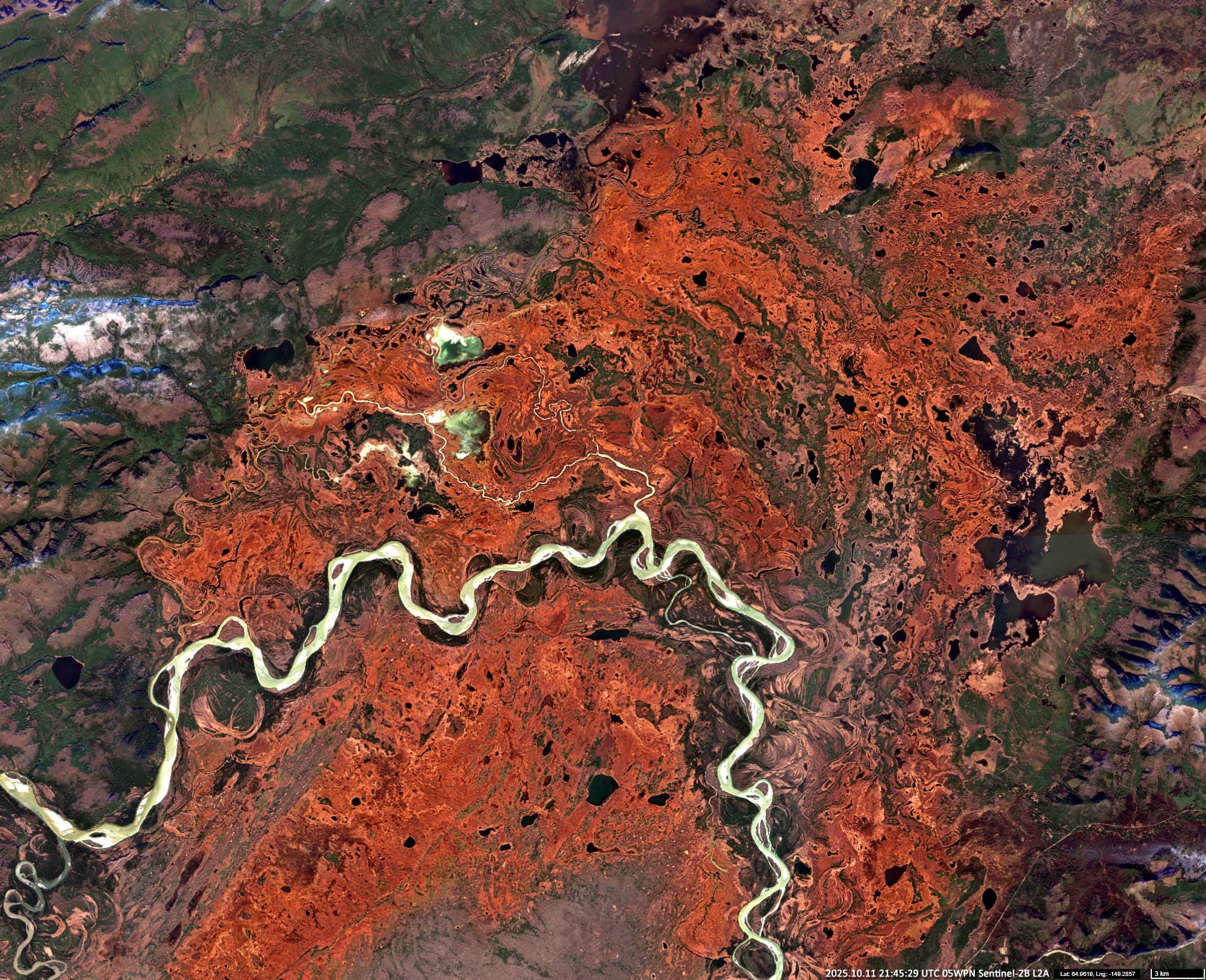 Three Sentinel-2 images of an area along both banks of the Tanana River, about 100 km east-northeast of Fairbanks in Alaska, are shown. The first image, acquired in early August, shows a uniformly green forest. The second one, taken in mid-September, shows the first appearance of yellow foliage in certain species – possibly including deciduous and larch trees. The third image, taken in mid-October, shows widespread red colouration in deciduous species such as maple, aspen, northern red oak, rowans and some shrubs.