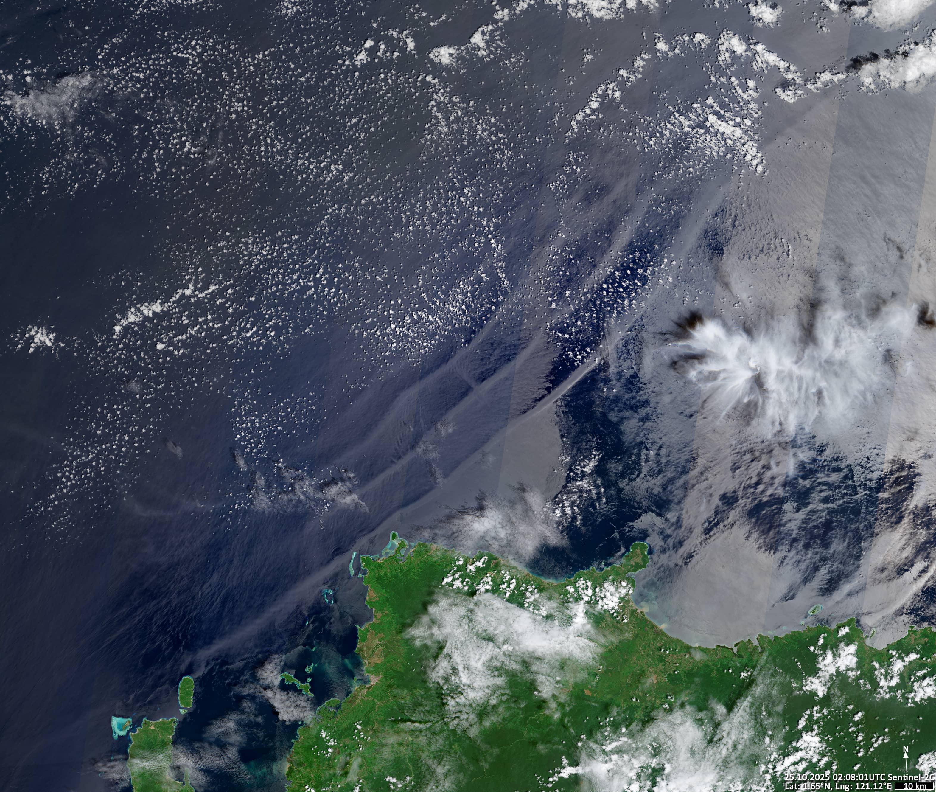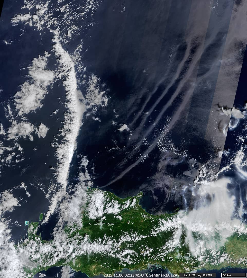 Relatively few dedicated investigations of internal waves in the Celebes Sea have been conducted to date. Here, we present Sentinel-2 satellite images of internal wave convergence patterns in the Celebes Sea, acquired on October 25 and on November 6 within the sun glint region (Figures 1 and 3). The image from October reveals three prominent internal wave packets extending up to 310 km in length, with individual wave crests reaching up to 2 km in width (Figure 2).